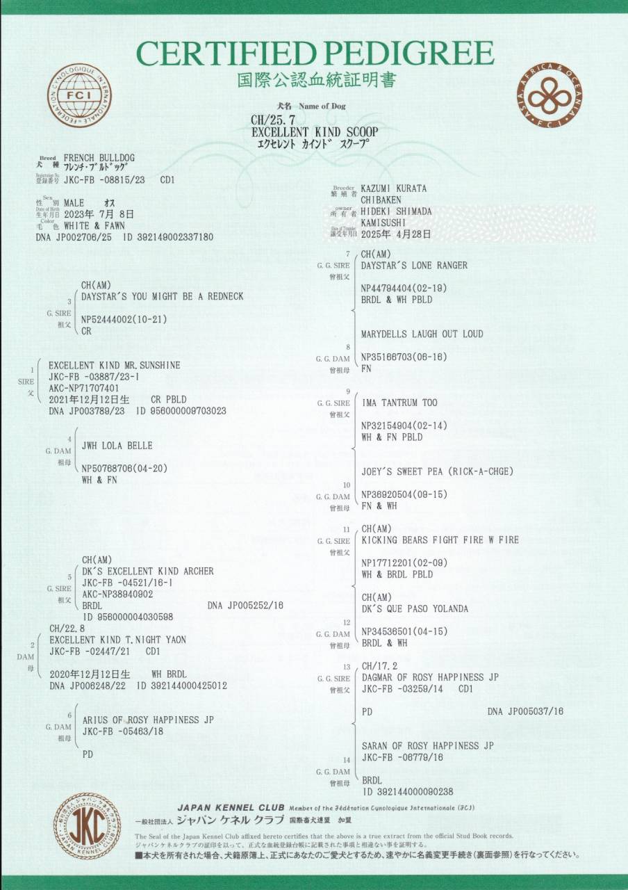 交配は人工受精にて、2回行います。交配日までに交配料をお支払いいただき、交配証明書発行いたします。お預かりの場合は、母犬の食べている餌をご持参ください。